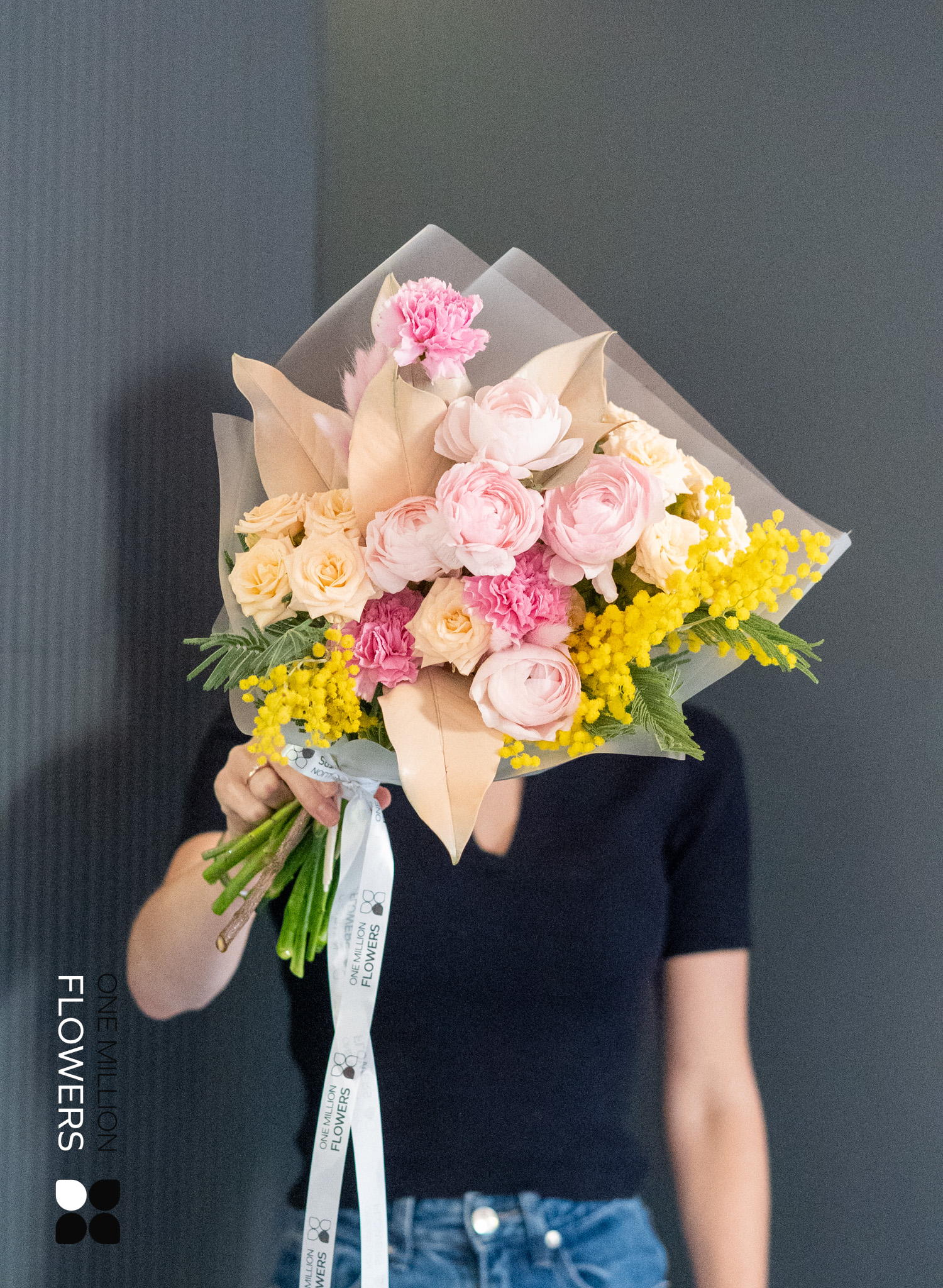 В букете "Нейми" Mate вы найдете: 5 розовых ранункулюсов, 3 кремовых диантуса (гвоздики), 2 мимозы, 3 кустовые розы Свит Сара (кремовые) и 1 магнолию. Каждый элемент был тщательно выбран для создания идеальной композиции. Ранункулюсы с их нежными лепестками и гвоздики придают букету изысканный шарм. Мимоза добавляет легкость, а кремовые розы олицетворяют элегантность и праздничное настроение.