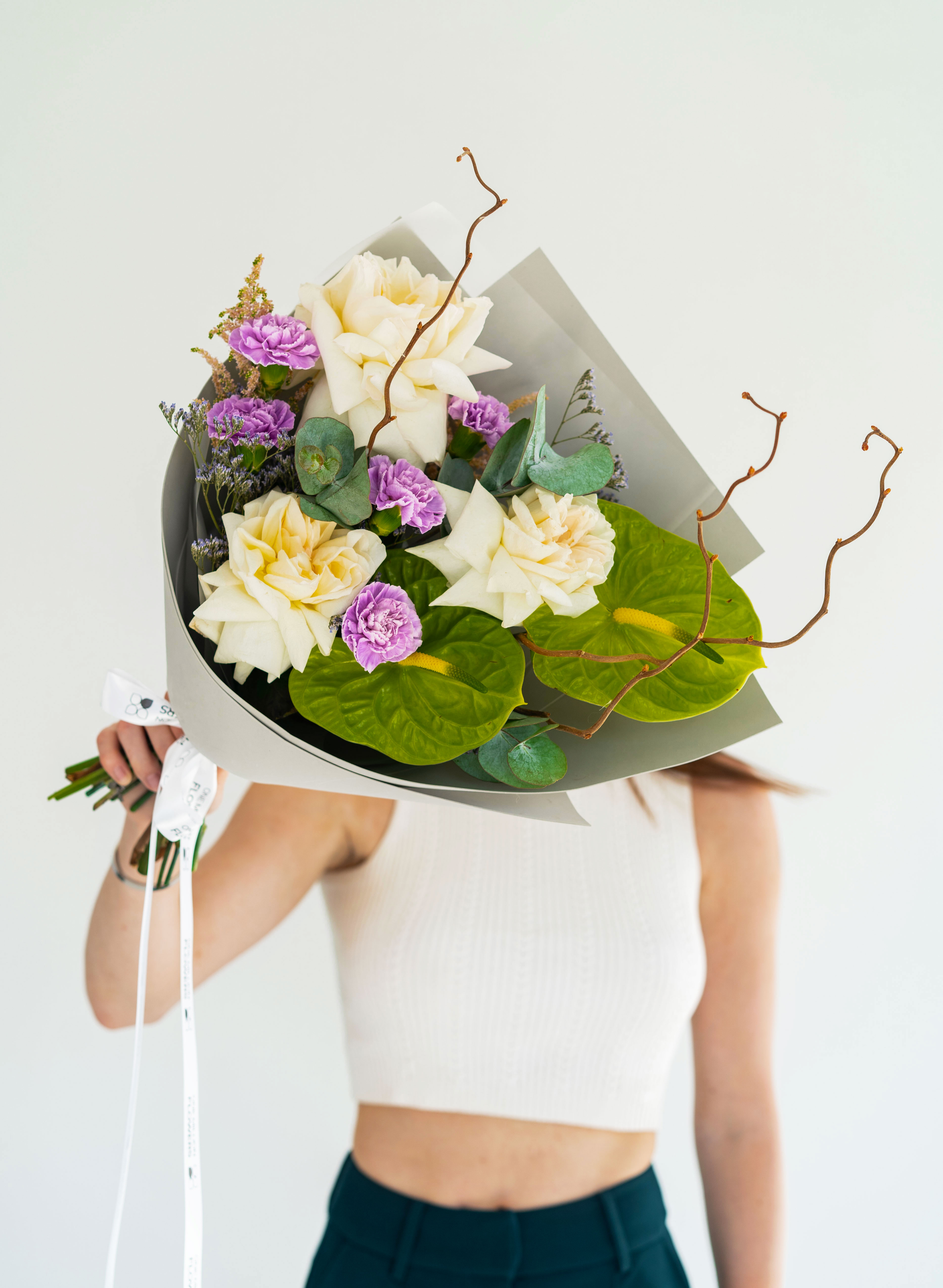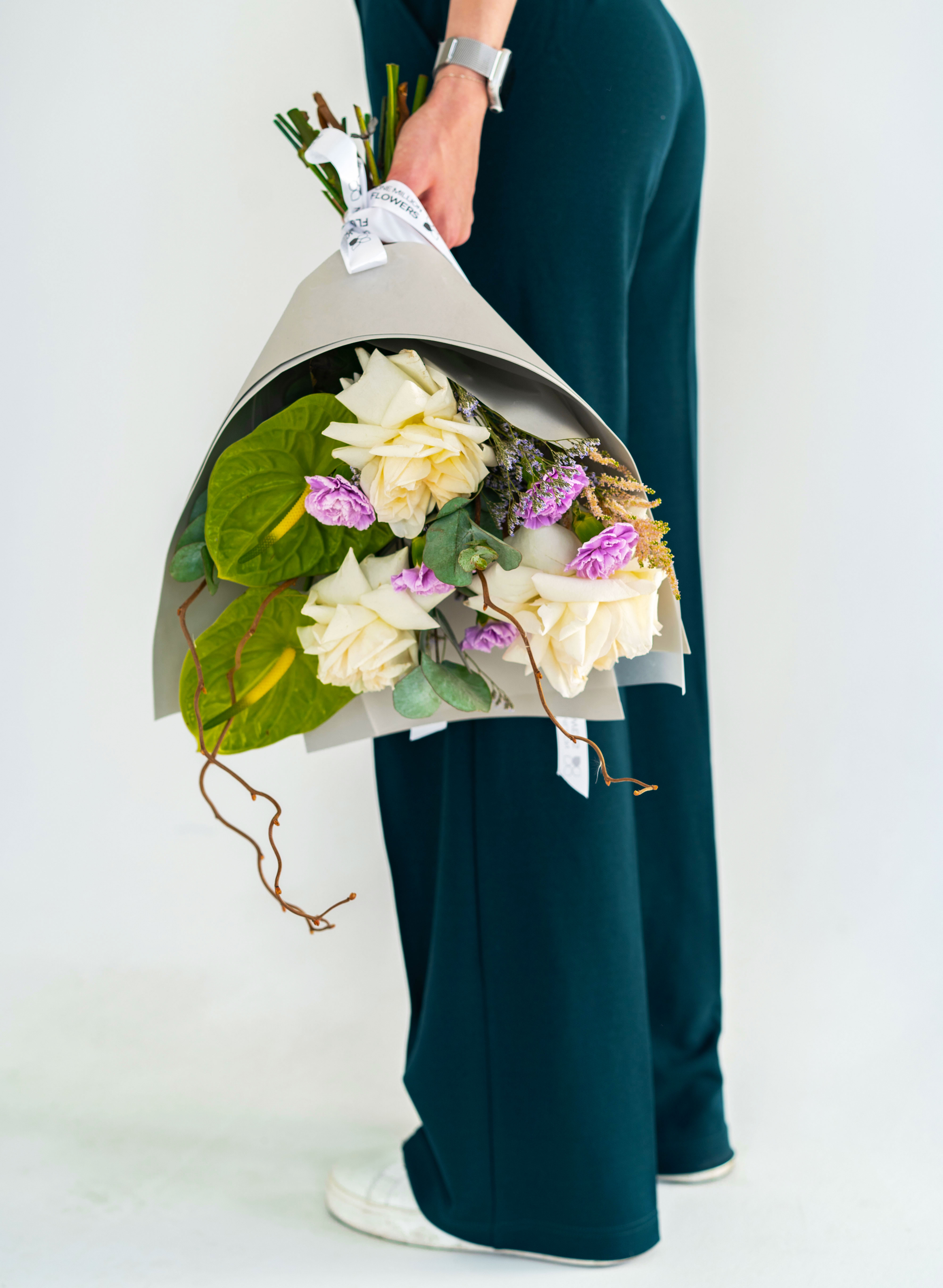 Изысканный и утонченный букет "Охара Концепт" Grey — это гармоничное сочетание классики и современного стиля. Нежные пионовидные розы "Вайт Охара" с их молочно-белыми лепестками создают основу композиции, дополняясь сиреневым диантусом и воздушным лимониумом. Элегантный антуриум добавляет выразительность, а веточки эвкалипта и корилиуса придают легкость и свежесть. Астильба завершает композицию, наполняя ее невесомостью. Этот букет подойдет для стильного подарка, подчеркивая утонченность и изысканный вкус получателя.