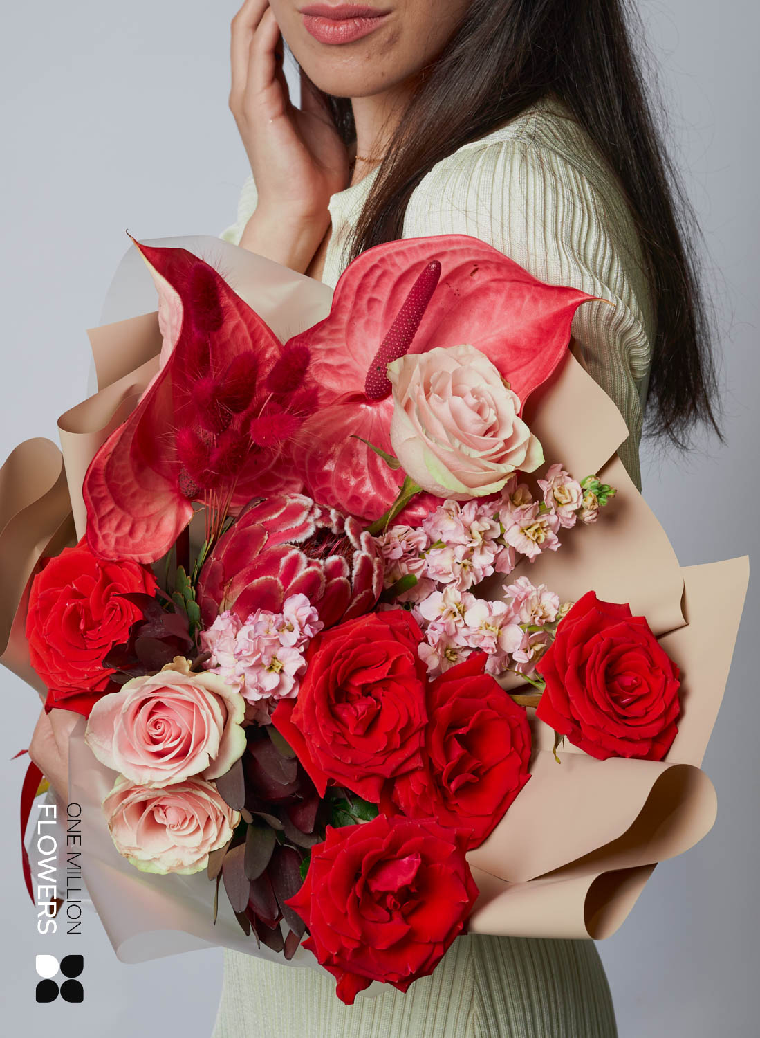 Букет "Ред Раннер" Cream — это не просто композиция, это настоящая цветочная симфония, созданная с любовью и вниманием. Этот букет состоит из различных растений, каждый из которых привносит свою уникальную ноту в общую гармонию. Маттиола розовая и роза Красная 50 в сочетании создают теплую атмосферу, а антуриум и протея добавляют яркие акценты, способные вызвать восхищение.