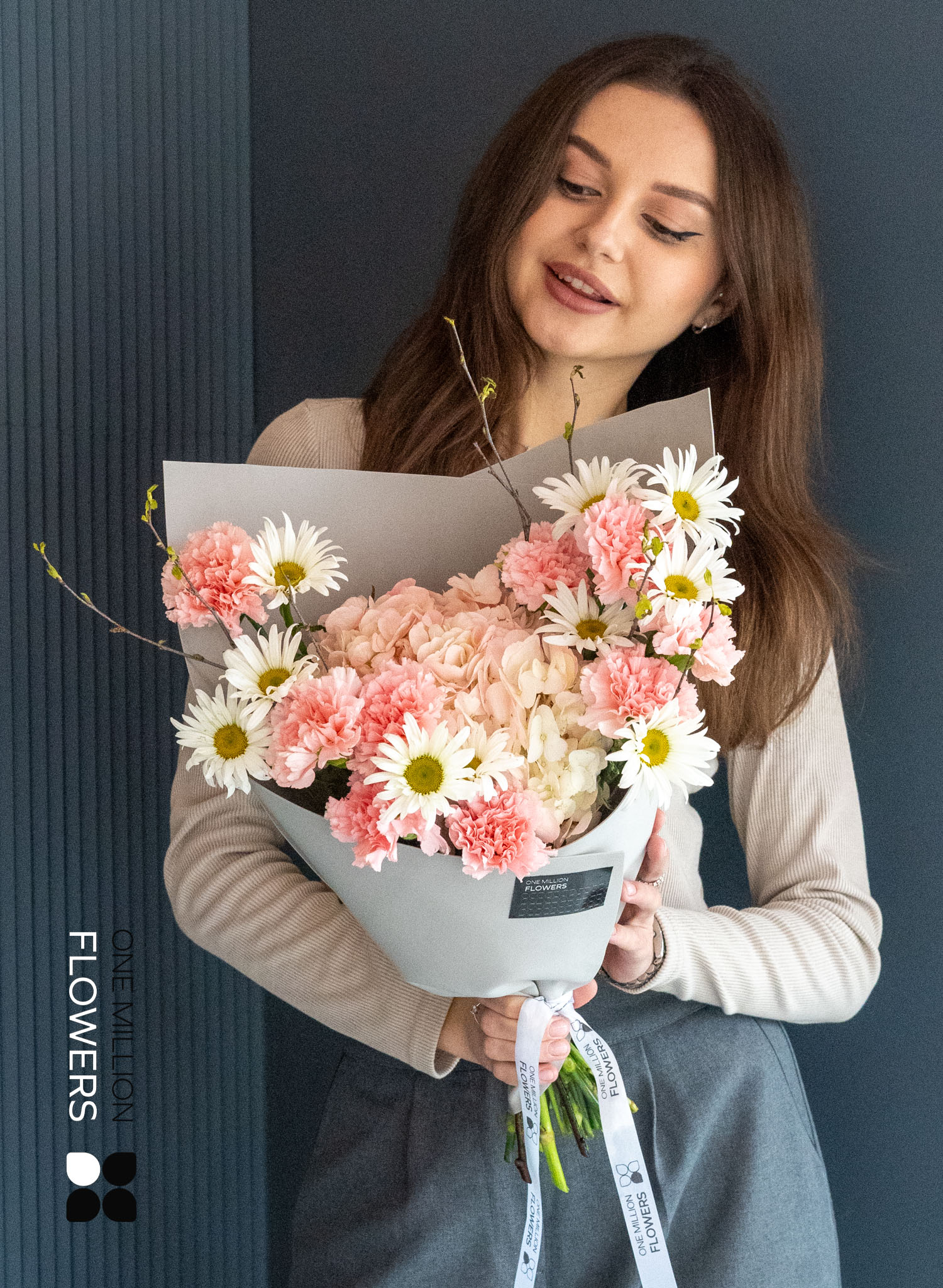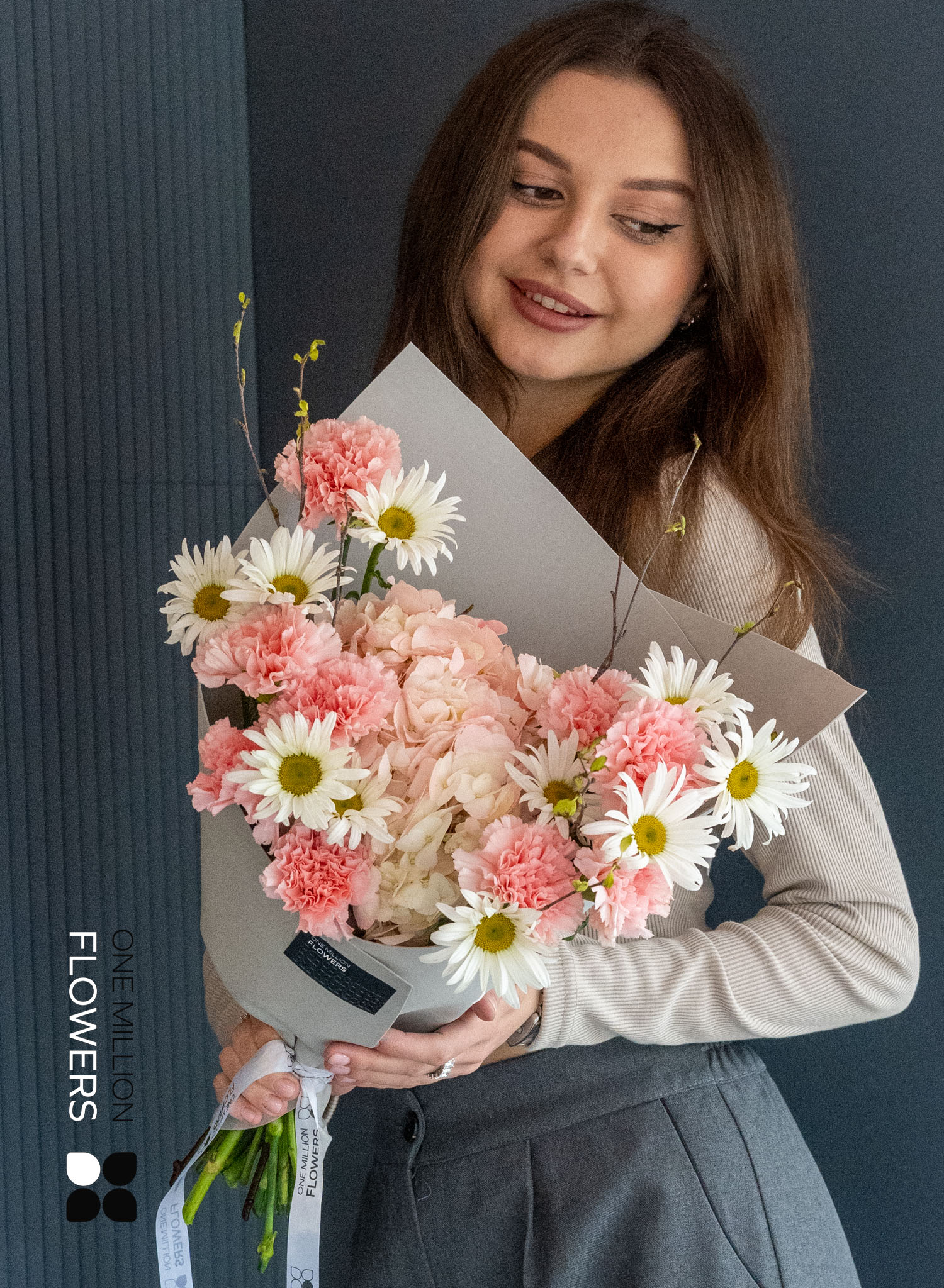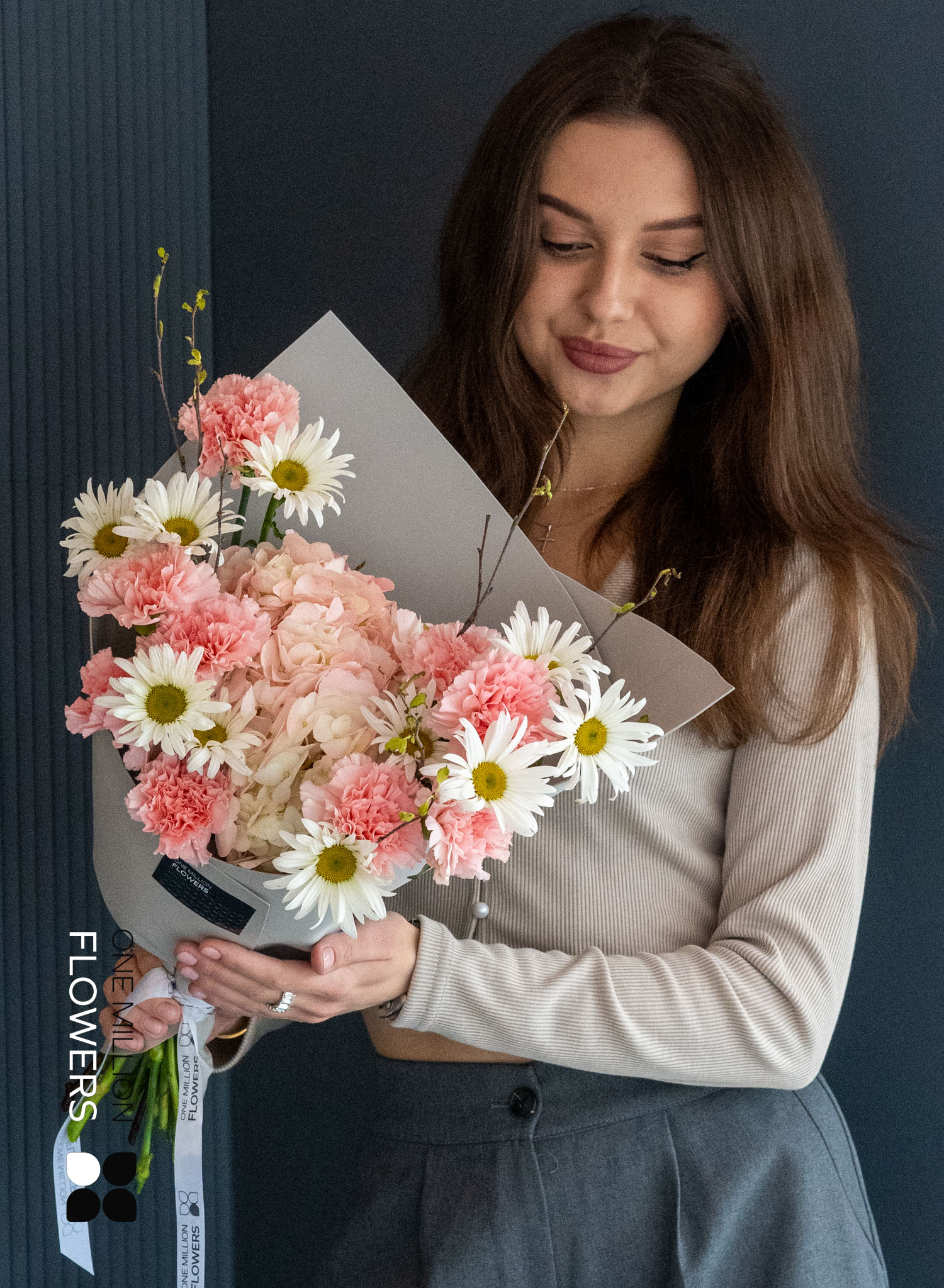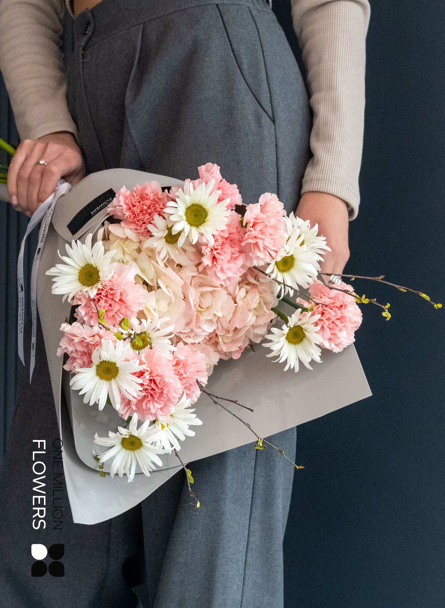 Букет "Самана Пинк" включает тщательно подобранные компоненты: две ветки берёзы, одну розовую гортензию, девять розовых диантусов (гвоздик) и десять ромашек. Такое сочетание создает не только красивую, но и выразительную композицию, в которой каждый цветок играет свою роль, дополняя и обогащая общую гармонию букета.