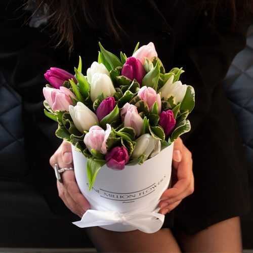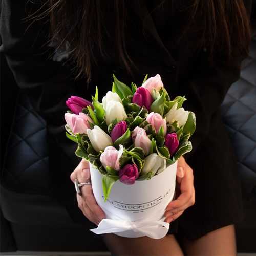 В этом неповторимом букете вы обнаружите 4 белых тюльпана, которые символизируют чистоту и свежесть. Красивые розовые тюльпаны (5 шт.) привносят немного игривости и радости. И последние 5 фиолетовых тюльпанов добавят загадочности и индивидуальности вашему подарку. Великолепные питоспорумы (9 шт.) заполняют композицию зеленью, придают ей объема и завершают гармоничность всего букета.