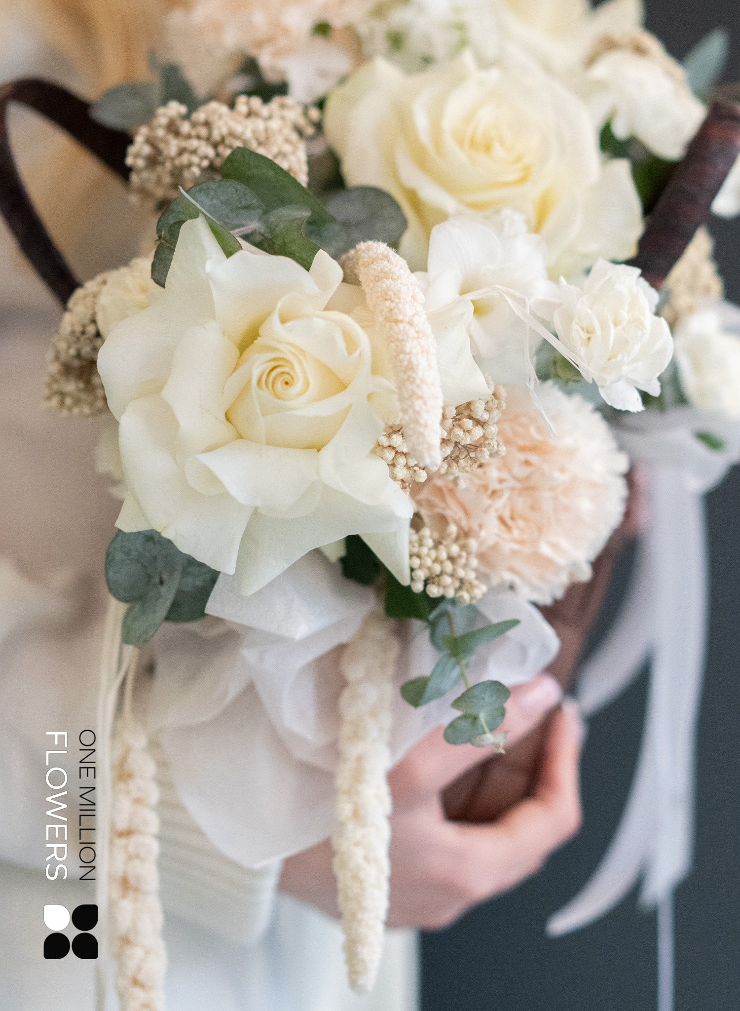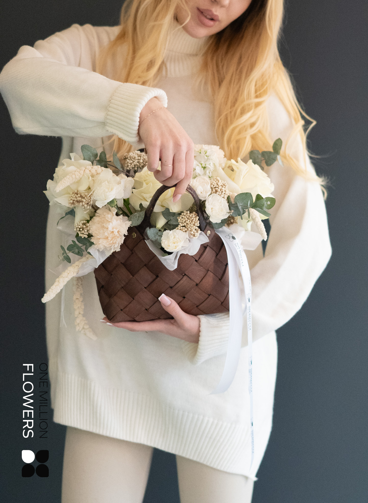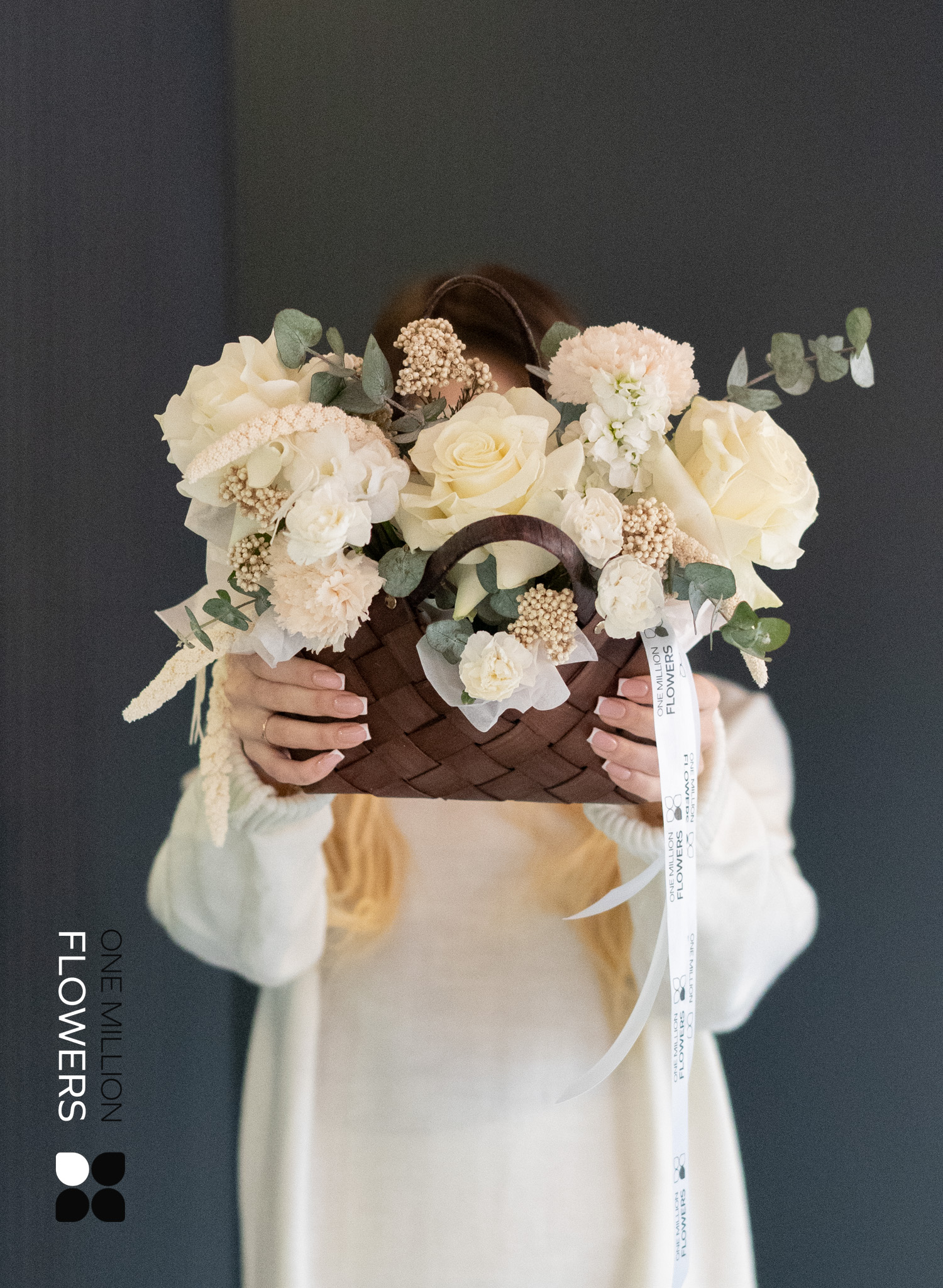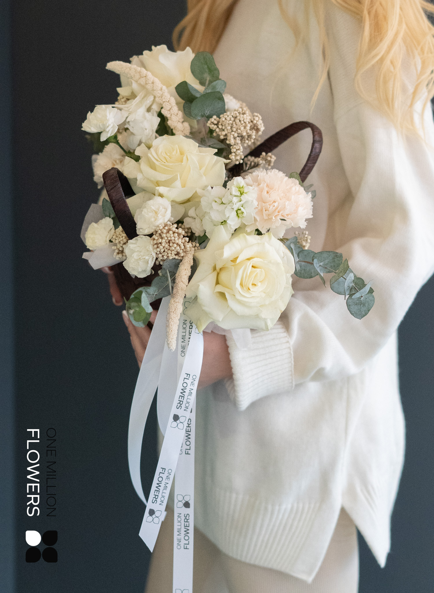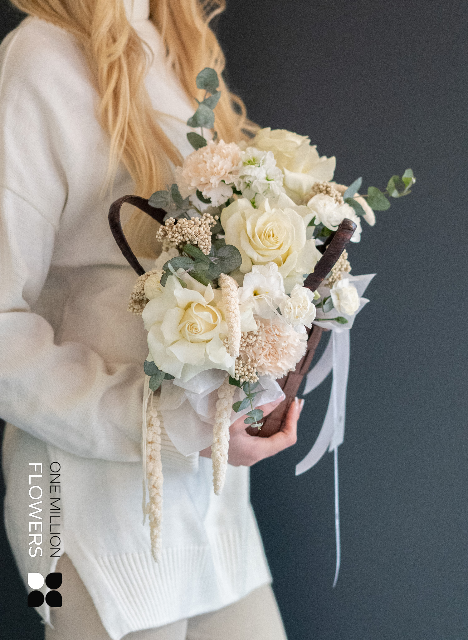 - 3 белые розы Эквадор Мондиаль - 1 мини-корзина для цветов - 3 кремовые гвоздики (диантус) - 3 кустовые гвоздики (диантус) белого цвета - 2 ветки эвкалипта - 1 ветка озатамнуса - 2 ветки маттиолы белого цвета - 3 ветки зелени сетарии